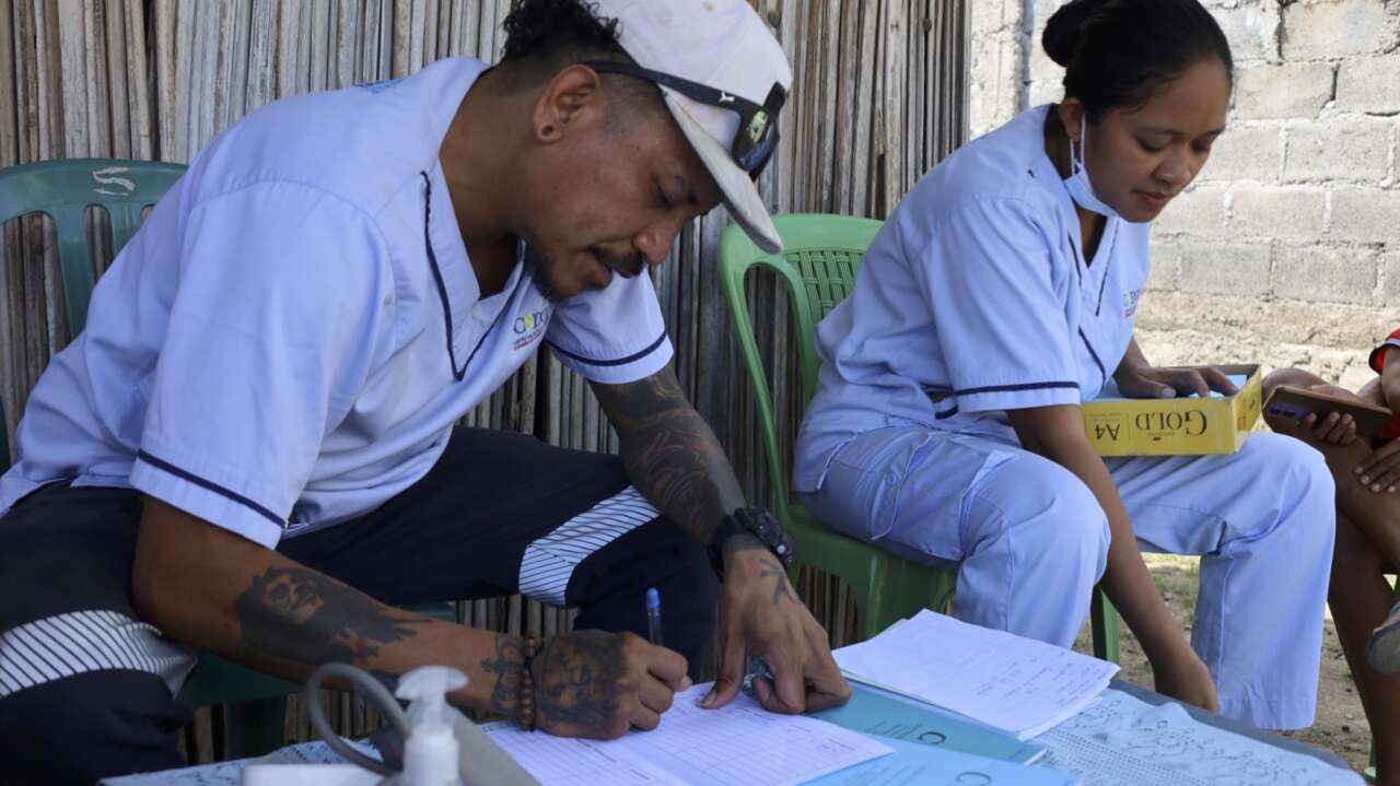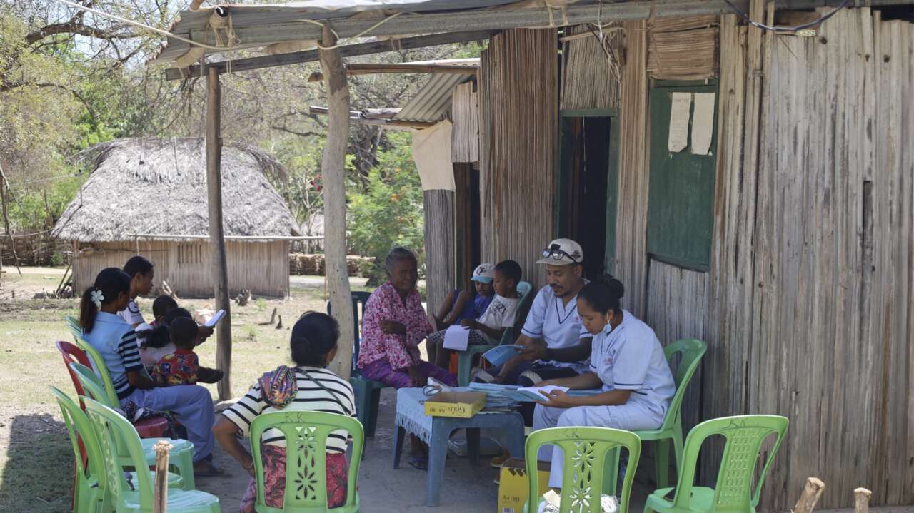 Photo: Elvino and his team (nurse) conducting a basic health consultation for the community in Fatugnala, Ulmera.